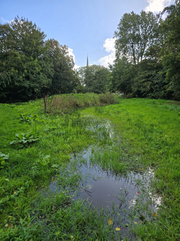 Een van oorsprong (te) nat stukje grasland langs het Oudorperhoutpad achter de Paltrokmolen (straat) zorgde in het verleden in de wintermaanden voor wateroverlast op het naastgelegen voetpad. Om dit probleem op te lossen is het natte grasland uitgediept tot een langgerekte poel en daarmee ‘formeel’ onderdeel geworden van het park, daar waar het eerst een lastig te beheren terreintje was. De poel is in de wintermaanden watervoerend, maar valt in de zomer grotendeels droog. Deze bijzondere, bijna tegenstrijdige, milieuomstandigheden trekken planten aan die ’s winters tegen natte voeten kunnen en ‘s zomers drogere grond nodig hebben.