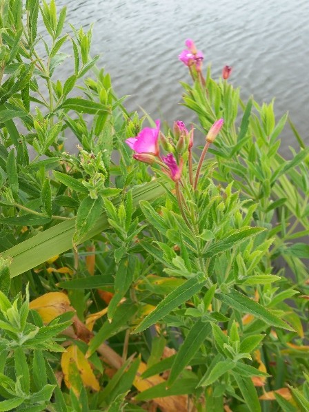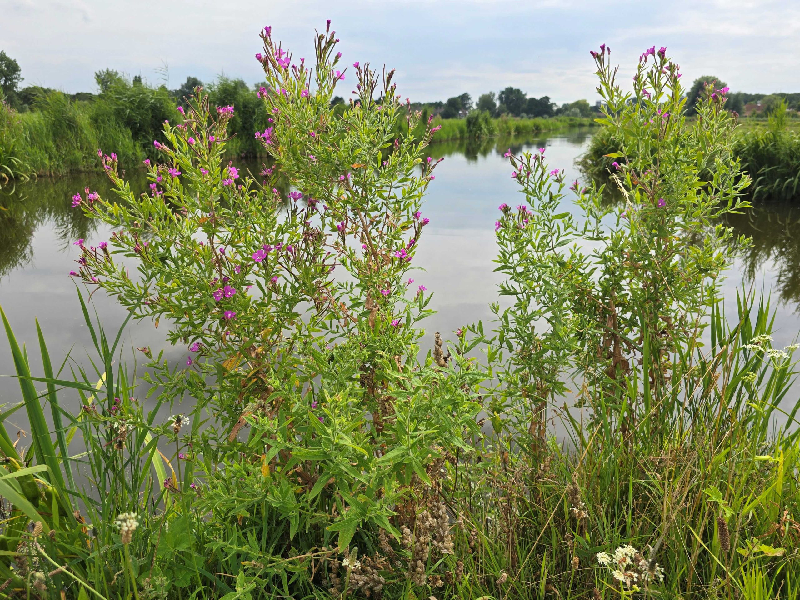 Een vrij algemeen voorkomende soort in de Oudorperhout is het harig wilgenroosje. Deze zomerbloeier herken je al snel aan de donkerroze kleur. Het wilgenroosje heeft grote viertallige bloemen met vierlobbige, roomwitte stempels. Zoals alle planten uit de Teunisbloemfamilie hebben ze een ondergrondse wortelstok. Je kunt dit goed zien op vochtige open plekken zoals rivieroevers, randen van rietbestanden, sloten en moerassen aan het feit dat ze een weelderige groei kennen, waarbinnen dan geen andere plantensoorten een plekje kunnen vinden. |